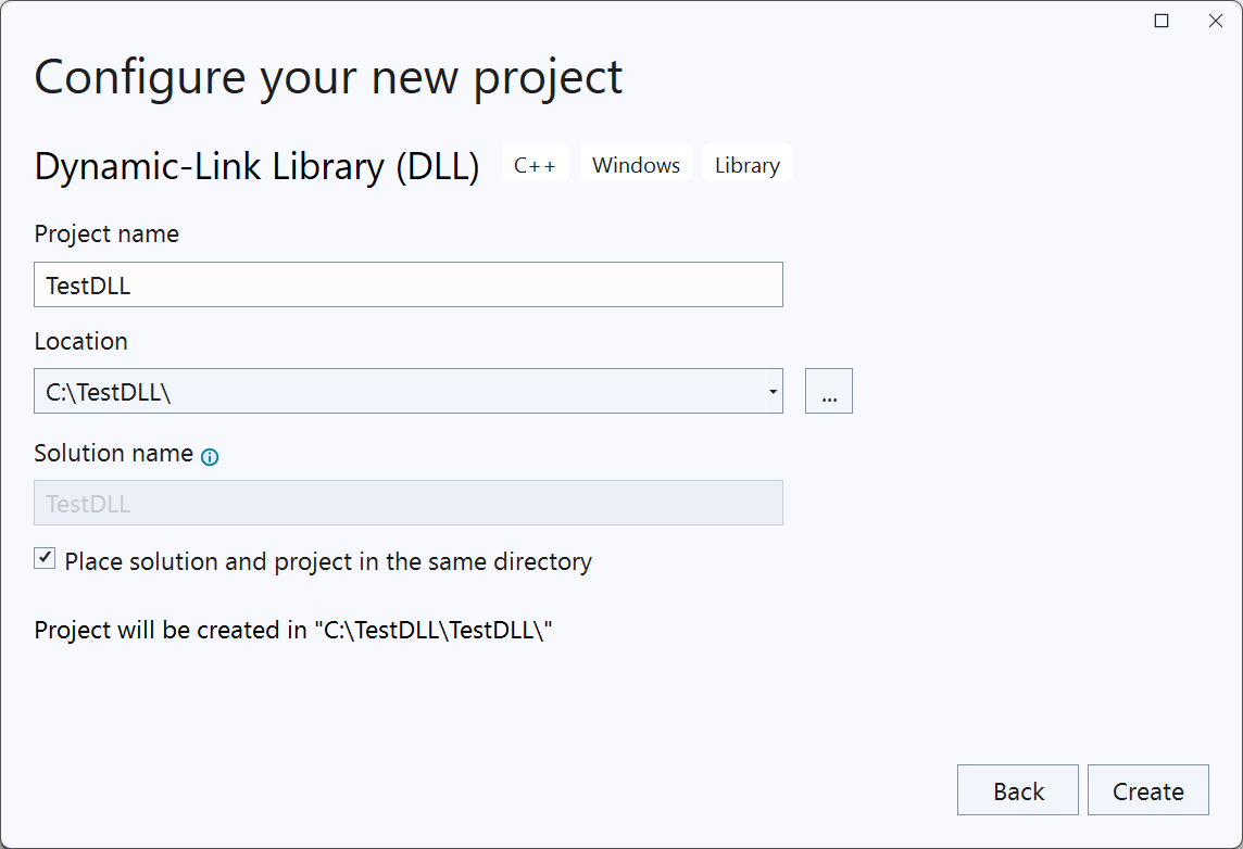 Once sorted, we now have to configure our DLL project, first off, by giving our project a name, here we'll name it "TestDLL", and we'll change the location of the project to something of our own, I've created a new folder on C: root drive called the same as the project name, so my path will be "C:\TestDLL", all in all, if you did the same, you should have something like this:-