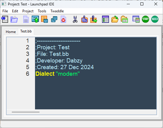 Another thing to note, the .bb file that's first created, and shares the projects name IS the main file in the project, every file after that is complimentary to this file. Why I mention this is in old skool Blitz, you can create, open whatever file in it's native IDE and compile/run that file as an individual piece of source code, in Launchpad, the main project file is concentrated on predominantly.