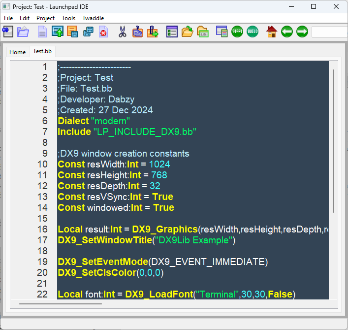 A quick note about the Dialect command there, this tells BlitzCC what "style" of Blitz BASIC you want it to accept when it's building your source code, by default in Launchpad, we like it set to modern, but there is 3 options in total, "classic", "secure" and "modern", please refer to the documentation for more info on each one.
